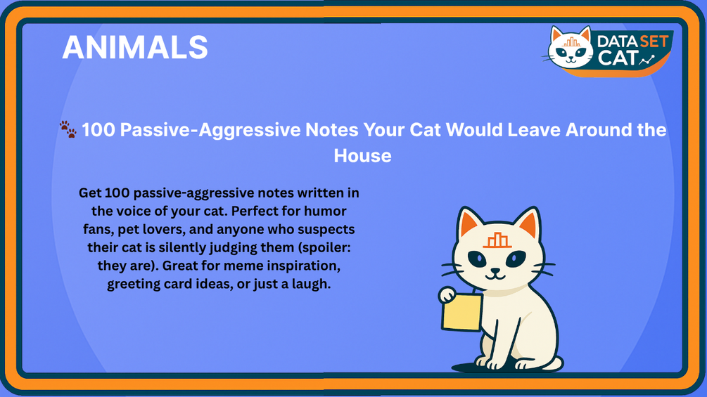 Get 100 passive-aggressive notes written in the voice of your cat. Perfect for humor fans, pet lovers, and anyone who suspects their cat is silently judging them (spoiler: they are). Great for meme inspiration, greeting card ideas, or just a laugh.
